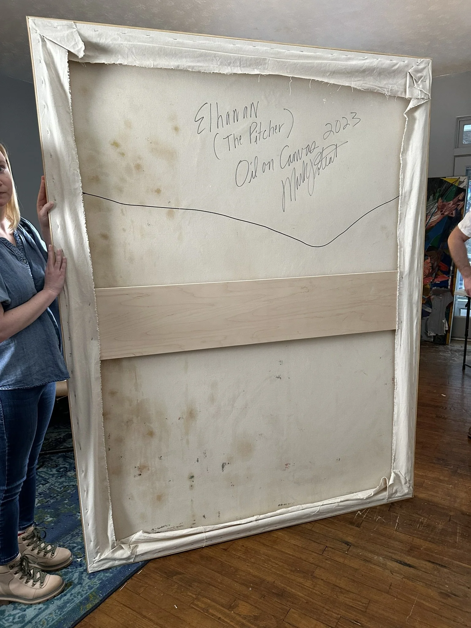 The painting, Elhanan (The Pitcher), takes as its subject a figure in the act of throwing a ball.