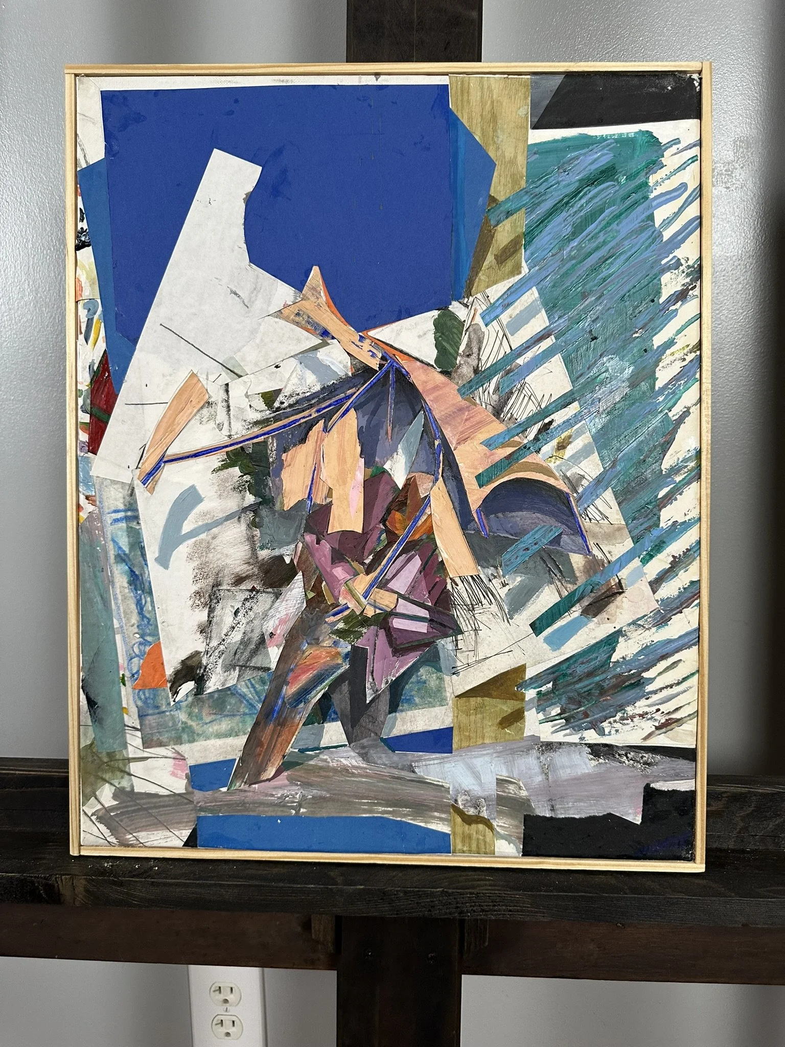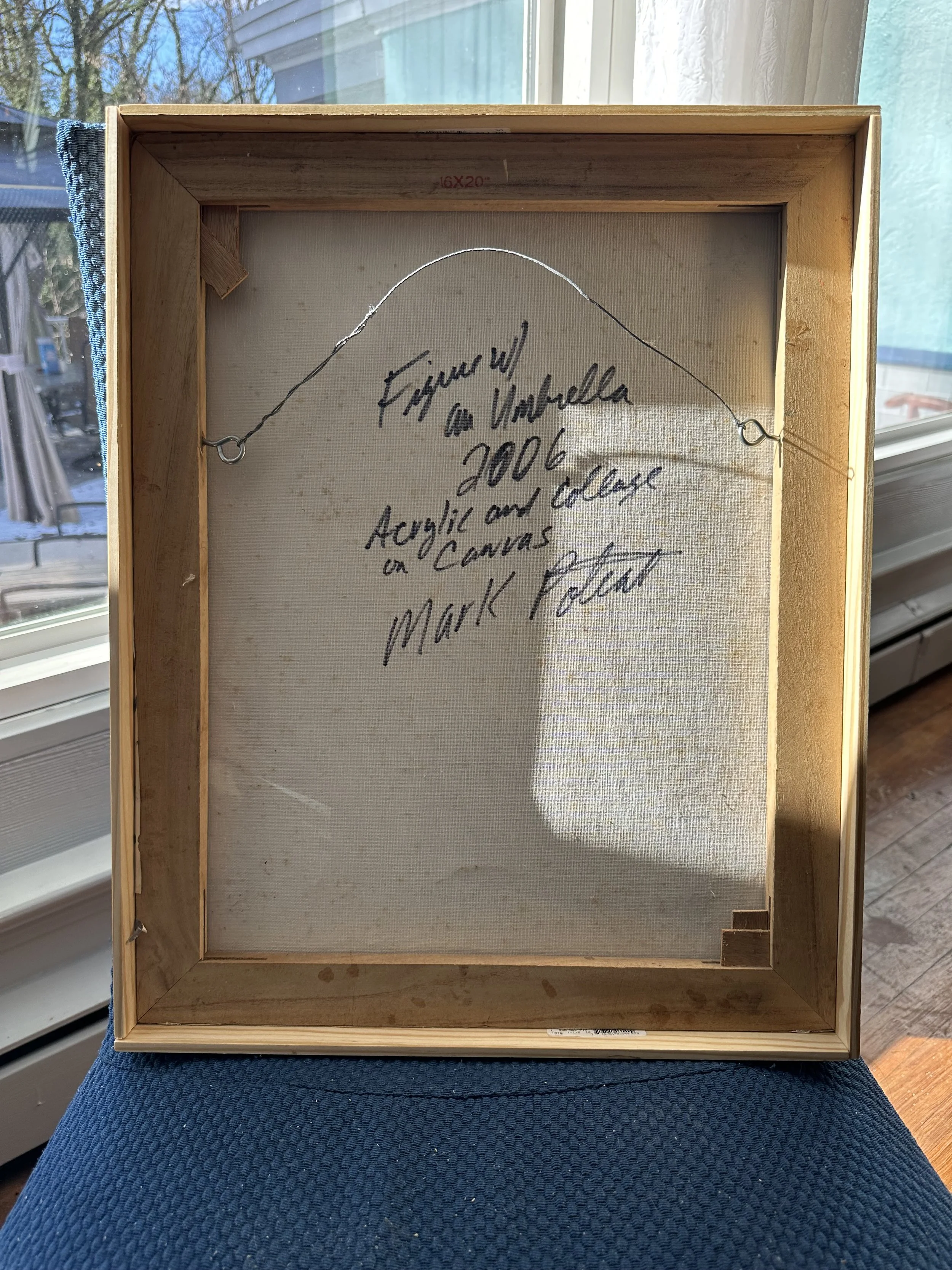 The collage painting, Figure With an Umbrella was completed in 2006. It was a part of a series of three paintings, that represent a figure umbrella in the midst of a downpour, while his umbrella is falling apart. It is an image that express the feeling of vulnerability and at times a sense helplessness. However, it is my hope that it expresses the drive and determination of weathering the storm. The figure leans forward, so it also represents the act of confronting what is thrown at us and doing our best to move forward and to overcome and meet adversity head on.