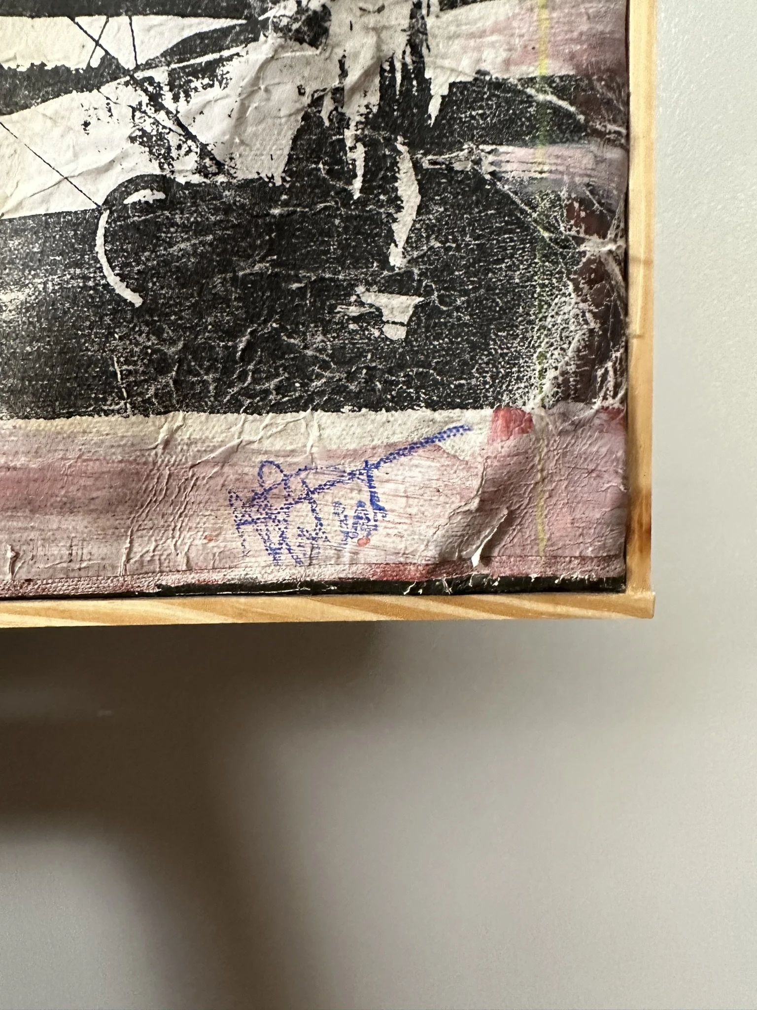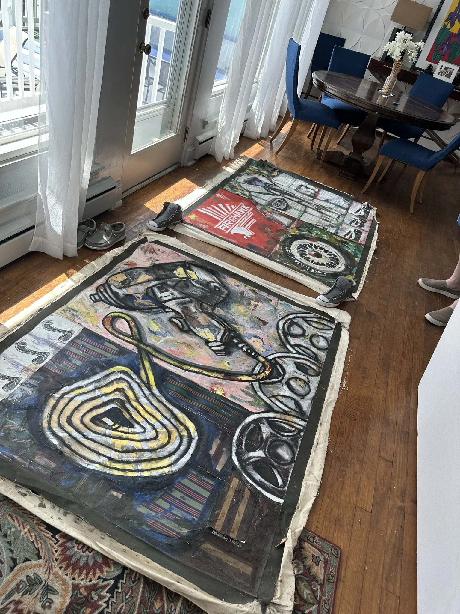 The painting Snake Charmer also completed in 1997 gets its title from a famous painting of the same name from the artist Henri Rousseau. It also references the the format association with the work of Jasper John’s completed in the 1980’s and an early work of his Target with four faces completed in the late fifties. Where on the left side can you see at the top four collages Xerox copies of the cobra mustang logo, and underneath a coiled air hose, this is a reference to John’s is painting. target with four faces.